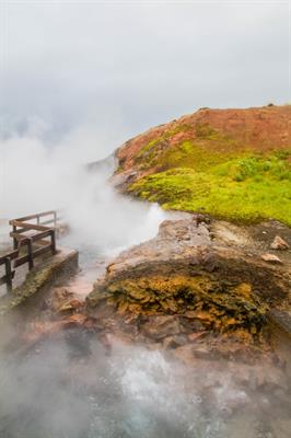 The inner counties of the region are just as interesting for visitors. You could go see the waterfall Hraunfossar (45 km / 28 mi), where the crystal-clear spring water flows from underneath the lava fields in multiple glistening streams. A little further along the road (51 km / 32 mi from Hestaland) is Húsafell, which is a popular campsite and recreational area where the rough highlands are just a stone’s throw away. As ever, there are many tempting hiking routes here, and various organised tours also depart from Húsafell, such as glacier tours and caving tours. 30 km (19 mi) from Húsafell is Deildartunguhver, Iceland’s most voluminous geothermal hot spring (26 km from Hestaland / 16 mi).
