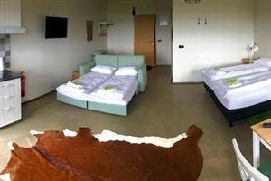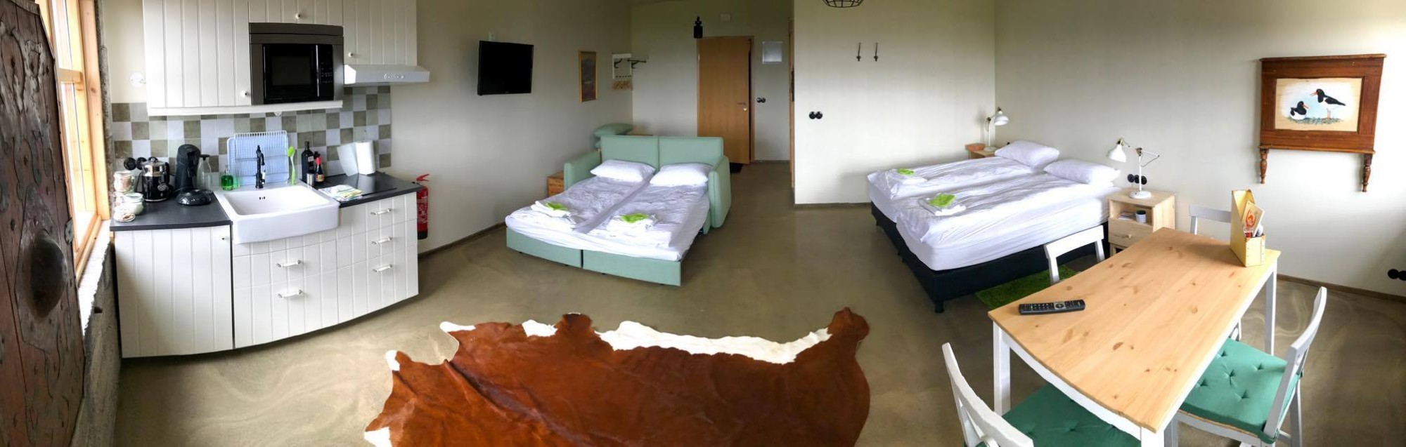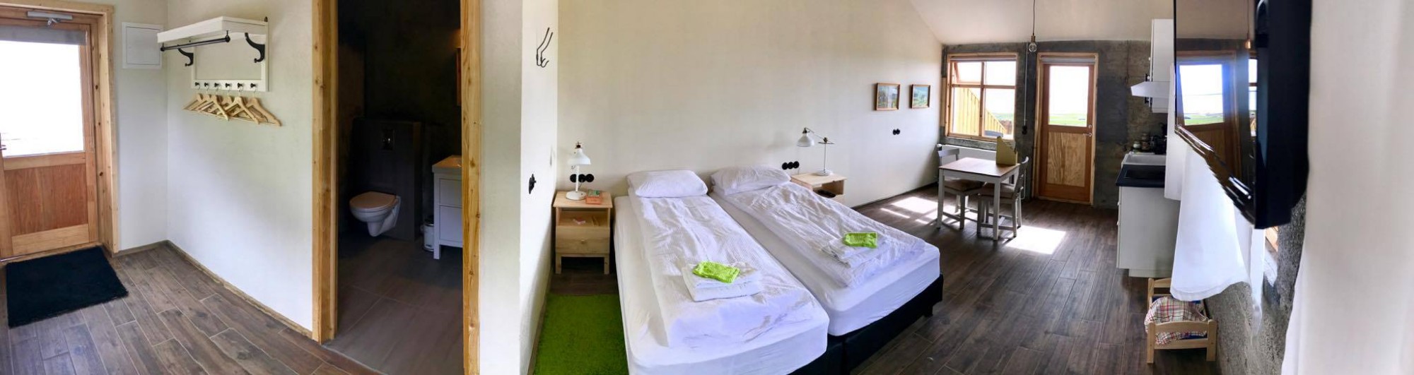 Each studio apartment has a fully equipped kitchenette with all necessary equipments for cooking and dining (plus coffee, tea, milk and condiments). The nearest supermarkets are in Hvolsvöllur (35 km) and in Vík (40 km). A few lovely restaurants in the area, such as at Country Hotel Anna (2 km) and Hotel Skógafoss (12 km). More restaurants in Hvolsvöllur and Vík.